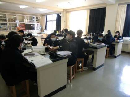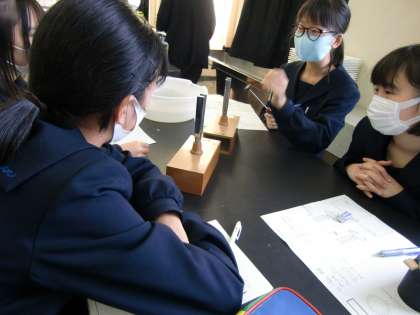 音の学習をしています。音さを使って、振動の様子を水面で確認しています。