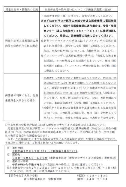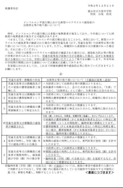 富山市教育委員会から「インフルエンザ流行期における新型コロナウイルス感染症の出席停止等の取扱いについて」が届きました。