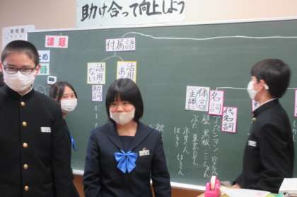 文法の学習をしています。班ごとに考えて単語を分類しました。