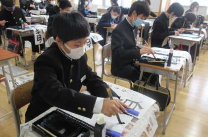 書き初めの練習をしました。令和3年の1学年の課題は「白き雷鳥」です。