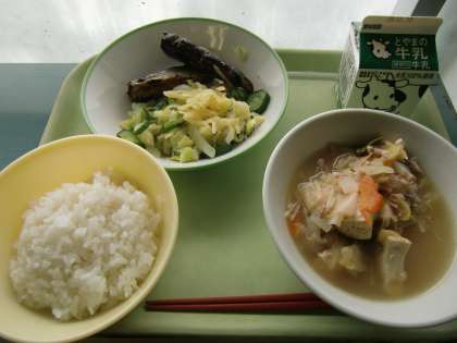 2学期最後の給食です。メニューは、ごはん、牛乳、いわしの昆布煮、あわせあえ、白菜鍋でした。