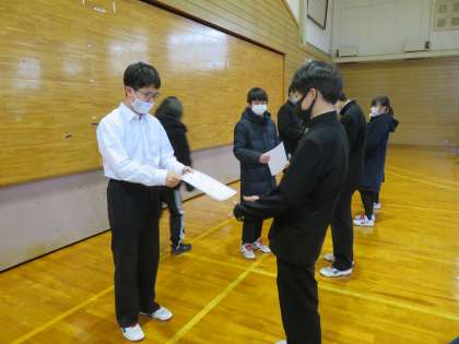 まず学年生徒会による2学期の振り返り(写真上)と先日行われた学年レクリェーションの表彰(写真中)がありました。
