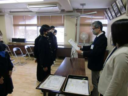 会議室で授賞伝達式を行いました。校長先生から1人1人賞状を受け取りました。おめでとうございます。