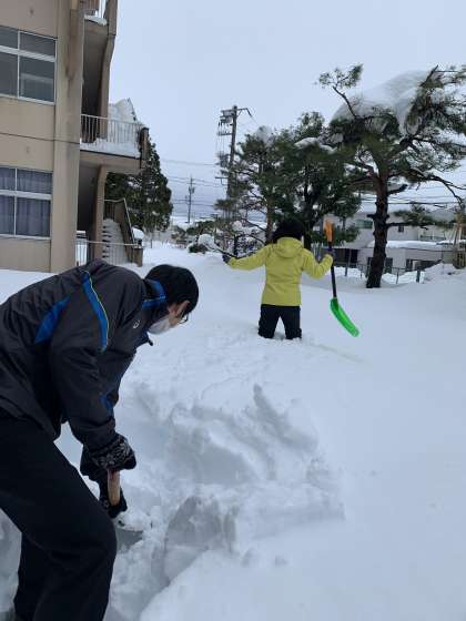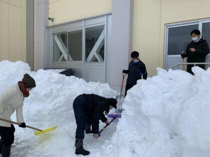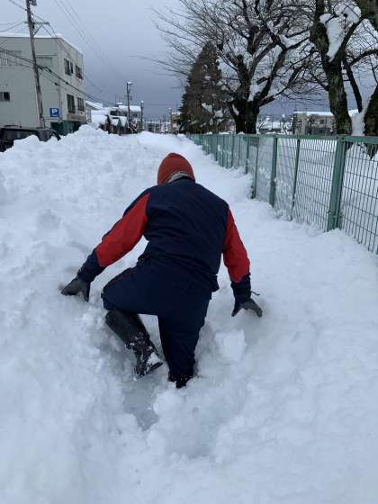 今日は、教職員全員で、学校周辺除雪を行っています。