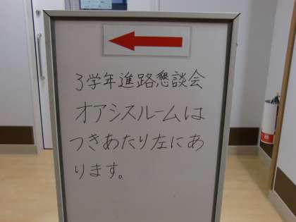 本日は3年生の進路懇談会を予定どおりに行います。雪がひどいので安全に気を付けてご来校ください。懇談会の場所は、北館1階オアシスルームです。案内に従ってお進みください。また、学校前の道路の除雪が進んでいませんが、駐車場は除雪されています。