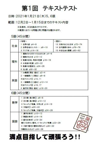12月から家庭学習として始めたテキスト学習の確認テストを、1月21日(木)に行います。毎日こつこつと積み重ねてきた成果を出せるよう、時間があるときにもう一度解き直してみるのもいいですね。