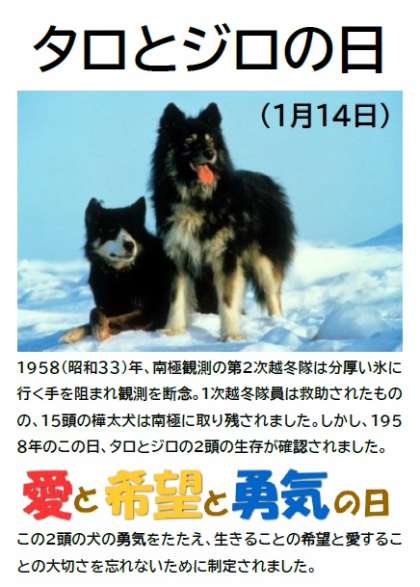 今日は、南極観測隊に同行した樺太犬のタロとジロが、南極に取り残されながらも仲間の帰りを待ち続け、再会を果たした日です。そして、「愛と希望と勇気の日」でもあります。愛と希望と勇気に満ちた、明るい日、明るい2021年になることを願って・・・。