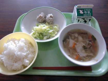 久しぶりの給食です。メニューは、ごはん、牛乳、ゆでキャベツ、チンズワンズ、ワンタンスープでした。美味しくいただきました。