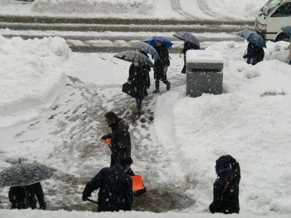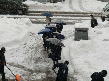 登校してくる生徒は1列で登校してます。足元が悪いので下を向いて歩くことが多いですが、屋根雪や車の動きなどにも注意して登校しましょう。また、時間に余裕を持って登校しましょう。