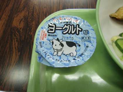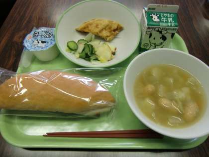 今日の給食は米粉コッペパン、牛乳、ヨーグルト、白菜とリンゴのサラダ、魚の竜田揚げ、野菜のスープ煮でした。