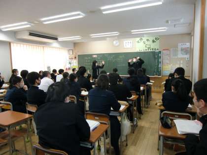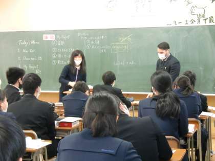 3学年は英語の授業です。今日はALTの先生と一緒に授業をしています。とても楽しく授業を進めています。