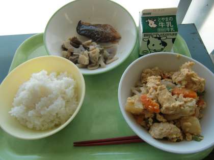今日の給食です。ごはん、牛乳、レンコンの香り炒め、ふくらぎの照焼き、厚揚げの卵とじでした。