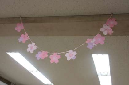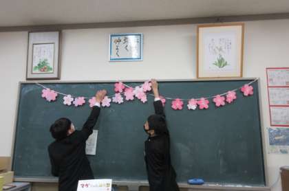 今日から2月ですね。春はもうすぐそこまで来ています。図書委員会では3年生へのエールを込めて、桜のデコレーションを行いました。