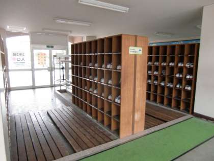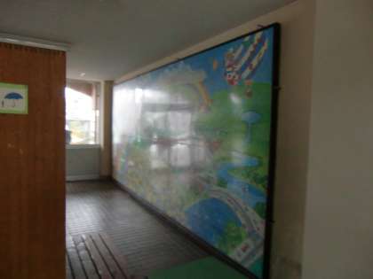 登校したら、生徒玄関から入ります。生徒玄関には大きな絵が飾ってあります。教室(北館)は左に曲がります。