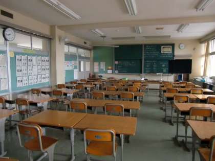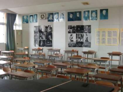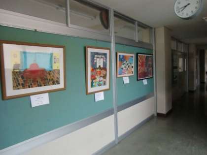 南館3階です。美術室と音楽室があります。美術室前には、美術作品展に出品した優秀作品や美術館関係のポスターが掲示してあります。美術室の中には、生徒の作品が展示してあります。授業や部活動で使います。