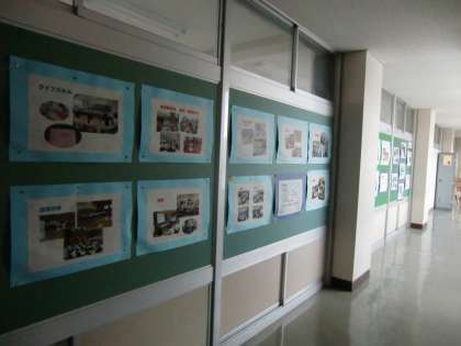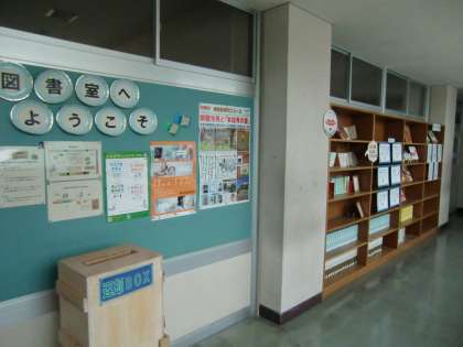 視聴覚室前、図書室前の廊下です。学校のあゆみや図書の紹介、季節の飾りつけがしてあります。楽しく利用しやすい図書室になっています。
