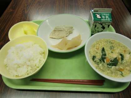 今日の給食です。メニューは、ごはん、牛乳、さわらの塩焼き、あんばやし、中華かきたま汁、カットパインでした。今日も美味しくいただきました。