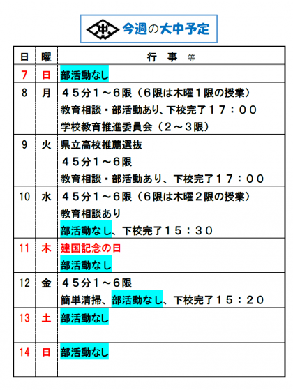 2月10日(水)から2月19日(金)まで学年末考査期間のため、部活動はありません。考査に向けて頑張りましょう。