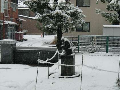 今朝はまた雪でした。考える人も寒そうです。登校した生徒は、今日も元気に健康観察をしています。