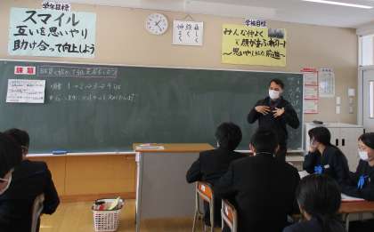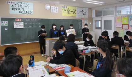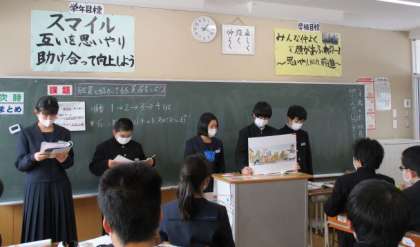 英語の教科書に出てくる「ばばばあちゃん」の紙芝居をグループごとに英語で発表し、ALTの先生に見てもらいました。発表が終わったら、ALTの先生からコメントををもらい、ただ読むだけでなく、強弱やジェスチャーを使うなど工夫されていてすばらしかったと言ってもらいました。
