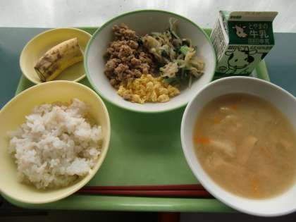 今日の給食は、麦ごはん、牛乳、二食丼(豚そぼろ、炒り卵)おひたし、みそ汁、バナナでした。美味しくいただきました。