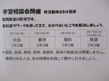 10日(水)に学年末考査の範囲発表を行いました。範囲表を見て、計画・実践表を作成し、2年生最後の定期テストに向けて取り組んでいます。