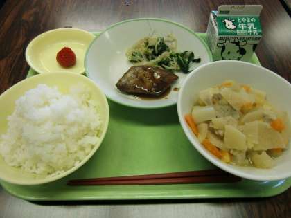 今日の給食です。メニューは、ごはん、牛乳、あじのみりん焼き、小松菜としめじのおひたし、大根のみそ煮込み、いちごでした。