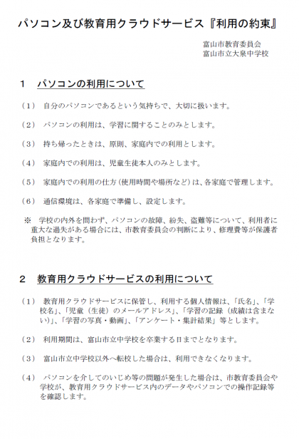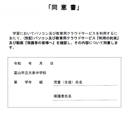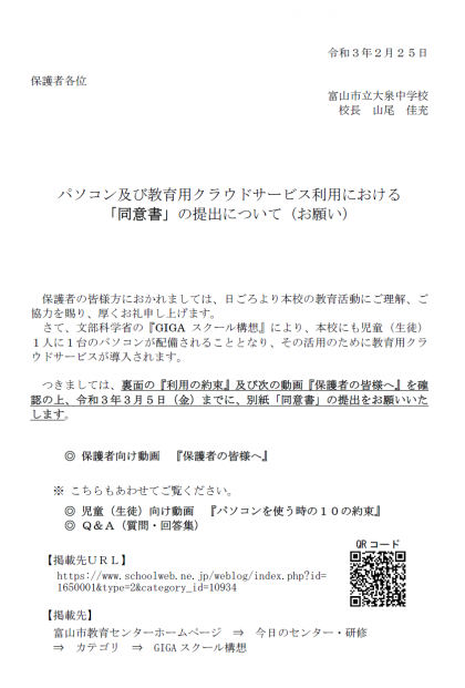 本日、下記の文書を配布しました。ご確認いただき、1、2年生は3月5日(金)までに同意書の提出をお願いいたします。なお、3年生については「利用の約束」のみ配布いたしました。