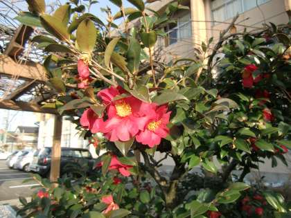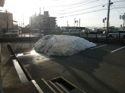 ずいぶん温かくなってきました。敷地内には、椿が咲いています。でも、その奥には山積みの雪が・・・今週は気温が高そうなので、全部溶けるかもしれませんね。