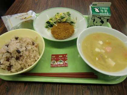 今日は卒業おめでとうメニューです。赤飯、牛乳、メンチカツ、コーンあえ、紅白白玉汁、お祝いデザート(シフォンケーキ)でした。3年生が給食を食べる日も残り少なくなってきました。味わっていただきましょう。