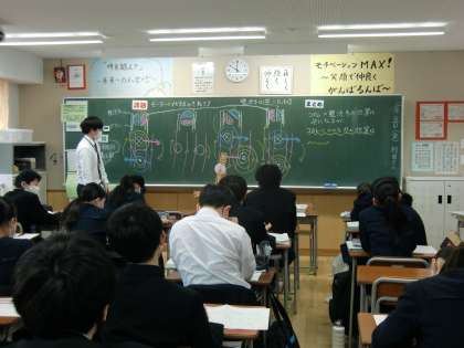 理科では、電流の学習をしています。今日は、モーターが回る仕組みを模型を使って学習しました。