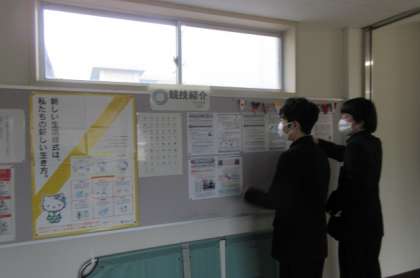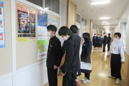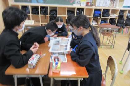 1年生は卒業式に向けて門出を祝う掲示の計画を立てました。昨年の写真を参考に、実際の担当箇所を確認しています。