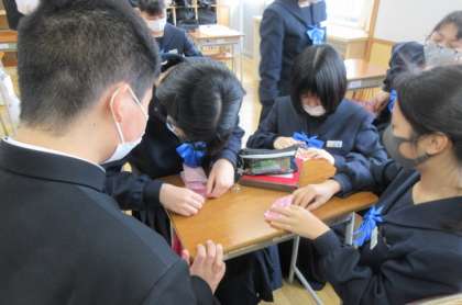 掲示に使う花を作っています。お互いに教え合っている様子です。