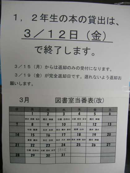 図書室での貸し出しが終了しました。まだ返していないない人は、返却しましょう。