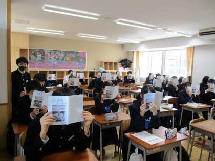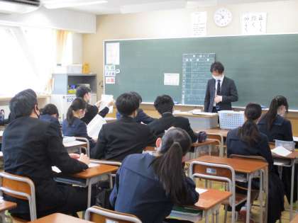 修了式の後、2年生最後の学活がありました。担任から、1年間の振り返りと3年生に向けてのアドバイスを受けながら、通知表を受け取りました。その間教室では、配布された生徒会誌「いずみ」を読みながら、静かに待っていました。
