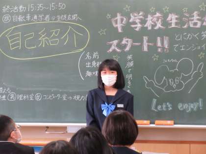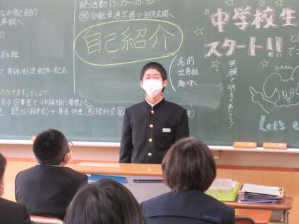 今年度の1学年は、単級となります。1クラス43名です。担任の自己紹介の後、生徒一人一人が前に出て自己紹介をしました。名前と出身校を言った後、自分の好きなアニメやゲーム、漫画、趣味や特技についていきいきと話してくれました。どの生徒も大きな声で堂々と話していました。同じ趣味をもっている人の話に反応をしたり、質問をしたり、大変盛り上がりました。
