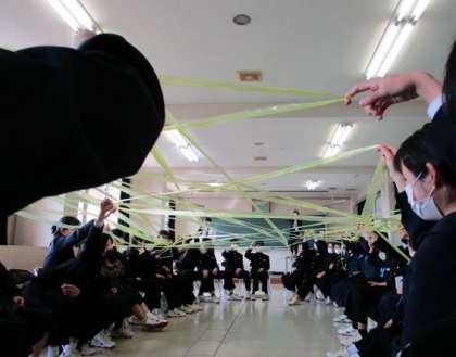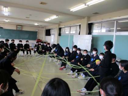 2学年全員でライフスキルをしました。自己紹介をして、次の人にひもを渡していくという活動です。最後には全員がひもで結ばれ、一体感を感じることができました。1年間、この仲間で仲良くしていきましょう!!