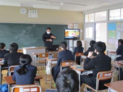 2年生になって初めての英語の授業をALTの先生と一緒に行いました。前半はALTの先生の春休みについて紹介してもらい、後半はクロムブックで教科書のQRコードを読み込み学習しました。生徒は音声を聞いたり、動画を見たりできることを知り、歓声をあげていました。