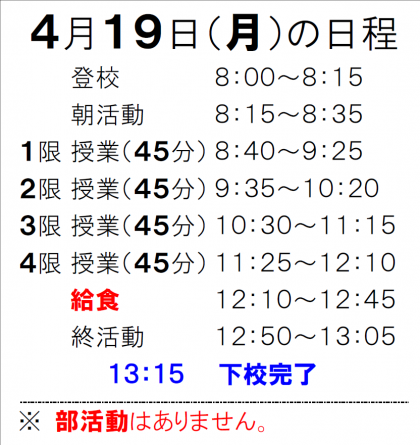 本校では、お伝えしていた通り、午前中に4時間の授業を行い、午後を放課とする日程で行います。よろしくお願いいたします。