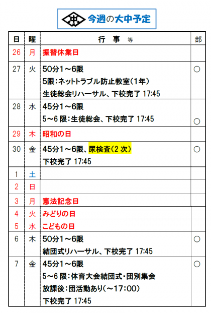 ゴールデンウィークに入りますが、生活リズムを崩さないように過ごしましょう。