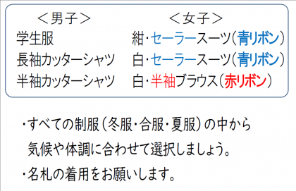 さて、最近、寒暖差が激しく、時折強い風や雨が降る天候が続いています。そこで、皆さんの健康を守るために、天候や体調に合わせて、制服を選択しましょう。冬服・合服・夏服のいずれでも構いません。名札の着用をお願いします。