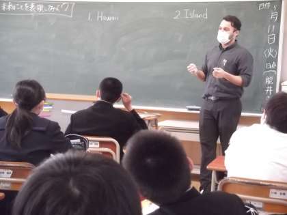 ALTのディーン先生が、フル英語で説明されています。生徒は、内容をしっかり聞き取ろうと、かなり集中しています。