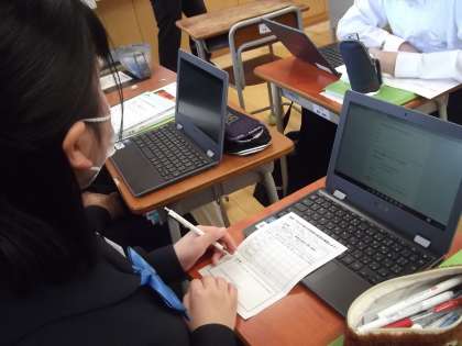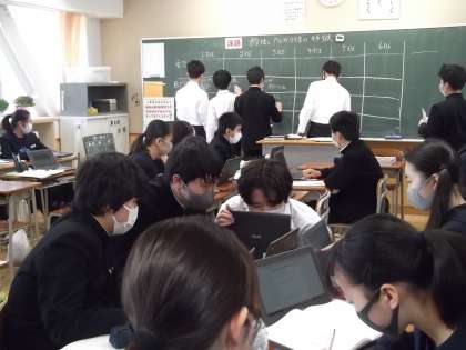 クロムブックを活用して、実験の結果をまとめています。一人学びの要素と学び合いの要素が共存する展開になっていました。