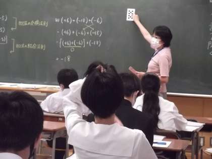 正負の数の計算を、トランプを使うことで分かりやすく進められています。