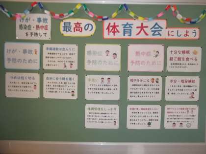 保健室前の掲示物です。生徒の健康を気遣う保健室の先生の思いが伝わってきます。事故や怪我のない健全な体育大会にするために、一人一人が責任をもって自分の健康管理に努めましょう。