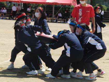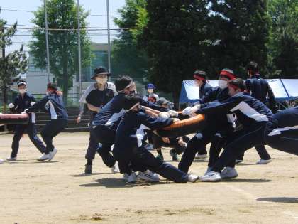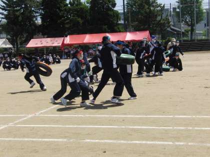 3年の学年種目「タイヤ引き」の様子です。今日の反省を元に作戦を練り直し、明日はさらにハイレベルな戦いになると思われます。