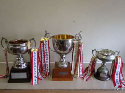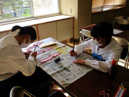 体育大会記録表彰係の最後の仕事として、トロフィーのペナントや賞状に心を込めて筆で書きました。