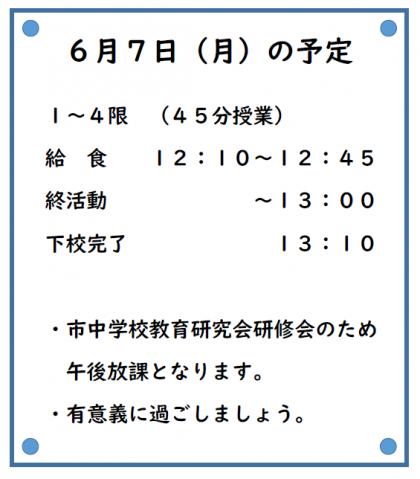6月7日(月)は市中学校教育研究会に、教職員が参加します。