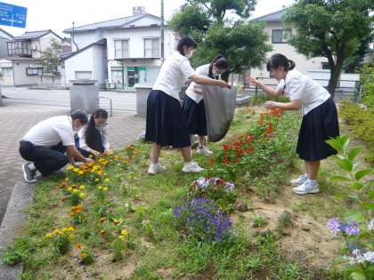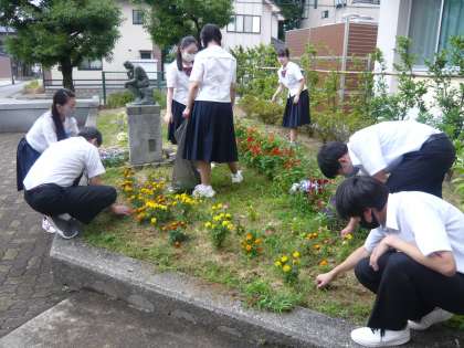 環境委員とボランティアの生徒で花壇の草むしりをしました。花壇を通りかかった生徒も進んで草むしりを手伝っていました。素敵な大中生ですね。