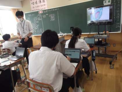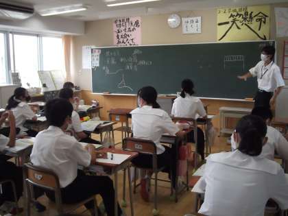 埋め立てや干拓について学習しています。教科担当者が、諫早湾の事業について詳しく説明し、生徒も身を乗り出して聞いていました。